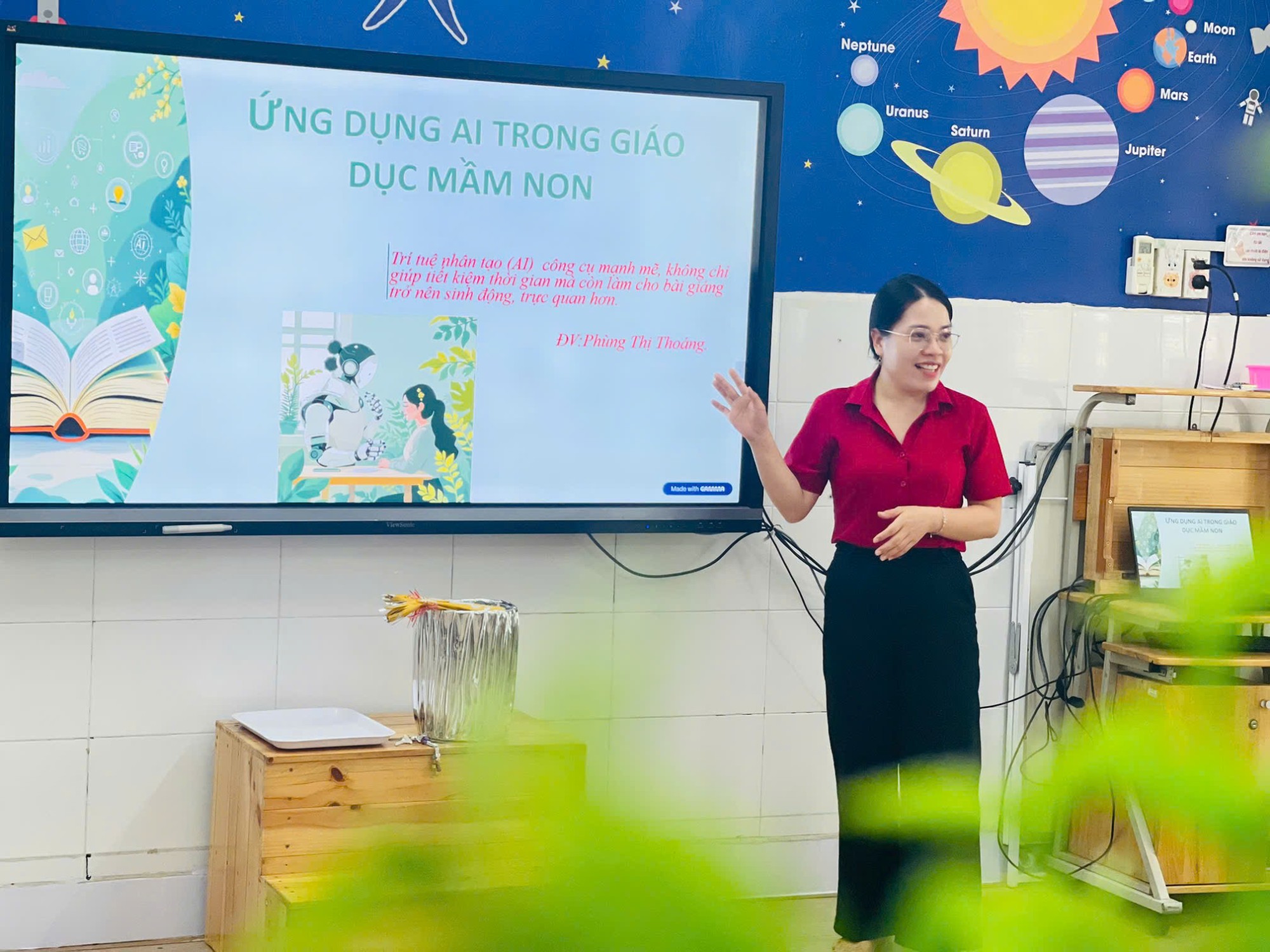 Song song đó, Chi bộ 6 đã tổ chức sinh hoạt chuyên đề quý III/2025 với nội dung “Ứng dụng AI trong giáo dục mầm non” do đảng viên Phùng Thị Thoáng trình bày. Báo cáo đã làm rõ các ứng dụng thực tiễn của trí tuệ nhân tạo trong soạn giáo án, thiết kế trò chơi học tập, xây dựng video minh họa… Từ đó cho thấy AI là công cụ hữu ích, góp phần đổi mới phương pháp dạy học, nâng cao chất lượng giáo dục mầm non trong bối cảnh chuyển đổi số.
