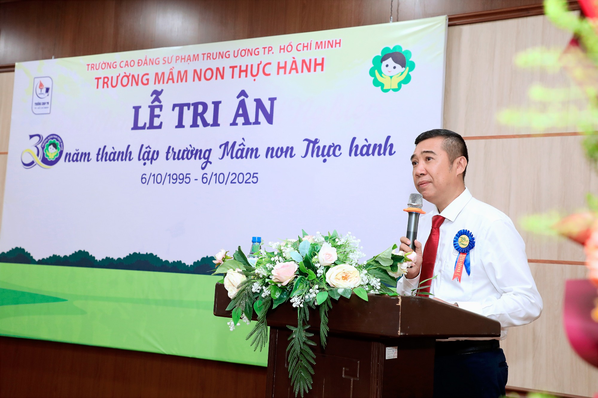 Ngày 04/10/2025, tại hội trường E4 – Trường Cao đẳng Sư phạm Trung ương TP.HCM, Trường Mầm non Thực hành đã long trọng tổ chức Lễ tri ân kỷ niệm 30 năm thành lập. Buổi lễ diễn ra trong không khí trang nghiêm nhưng cũng đầy ấm áp, là dịp để thầy cô, phụ huynh, trẻ và đối tác cùng nhìn lại hành trình ba thập kỷ vun trồng, cống hiến và trưởng thành.